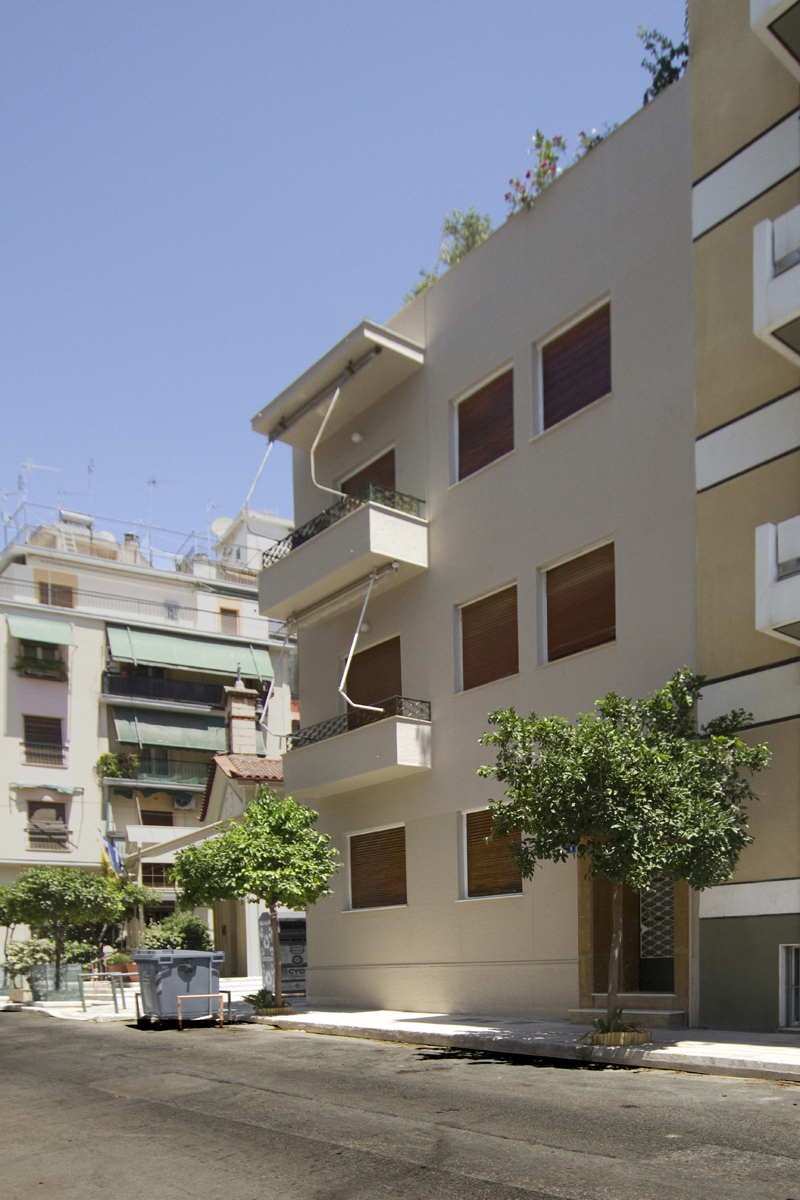 Dieses dreigeschossige Mehrfamilienhaus befindet sich in der Nähe des historischen Sanatoriums „Ásylon Aniáton“ im Stadtteil Athens Kypseli. Es handelt sich um ein Eckgebäude mit Blick von der Nordseite aus auf die kleine Kirche des Ágios Nikólaos.