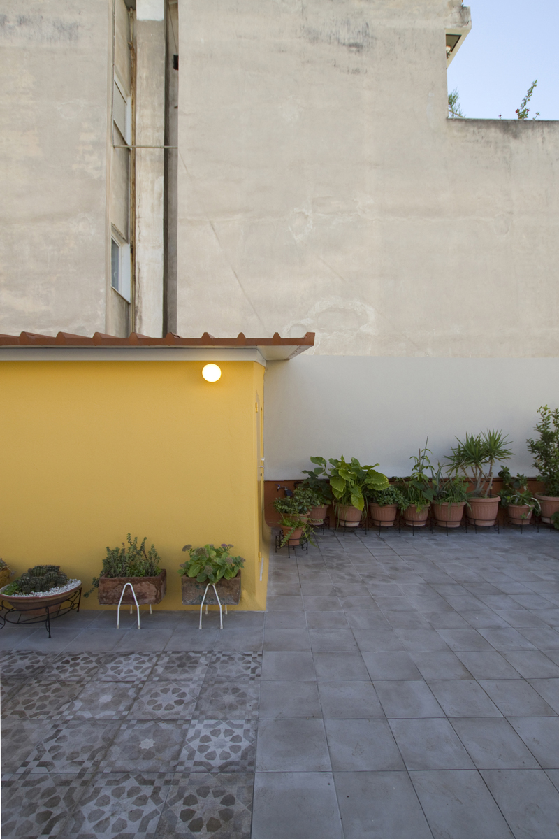 Nachdem wir im Dachgeschoss die gesamte Sperrschicht gegen Wasser und Feuchtigkeit saniert haben, verlegten wir dort keramische, wetterbeständige Fliesen. Der nun fertiggestellte Dachbereich ist ein verstecktes Refugium, umringt von einer großen Anzahl von Topfpflanzen.